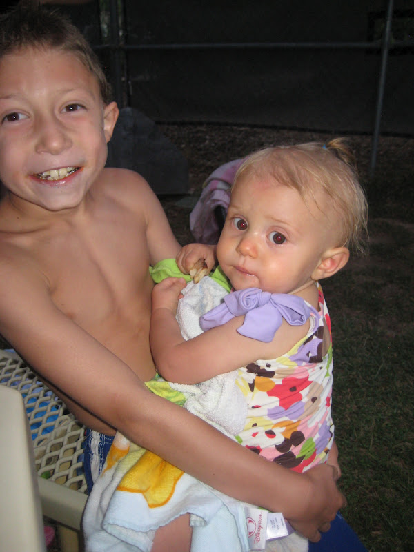 Amberly is so funny and such a good girl. Even when she doesn’t do what she’s supposed to, she immediately feels bad for it and tries to make it right. She is totally a blue personality. One night we had just gone to the pool and then the play place at Burger King (I have now been play placed out for a while! Those kids were spoiled with play places! I stayed there for like 3 hours once and we went to at least 3 different play places! I’m kind of sick of them!) so when we got home I told Austin to get in the shower, then help Tyler get in the tub, wash his hair and make sure he was ready to get out before he played in the tub. Amberly got in and I told her to stay in until I came back to do her conditioner/brush out the snarls hair routine. She was playing in the bath. I snuck away just quick enough to hurry and jump in the shower. Brought Ash into Mike and Liz’s room with me, gave her toys to play with and speed showered so I could feel comfortable (because when I’m wet and tired and still in my suit etc, I’m more cranky, and I needed all the patience I could muster to get through the next hour.) So I hurried really quickly, thinking they’ll just play in there and it will be fine. Well, when I got out, what do you know Amberly was running around in a towel, hair not washed. Tyler was running around in a towel and everything was in an uproar! I told Amberly that I had specifically told her to stay in the bath until I came and got her. She was soaking wet and getting water everywhere etc. I said, “Now you have to get back in and we have to do your hair. If you would have just stayed in the bath it would have been easier for everyone. No dessert for you.” She was upset, but completely understood. After dinner, she brought her plate over, didn’t really say anything, and just went to her bed and went to sleep. I felt so bad, because I didn’t even get to apologize for being so abrupt.